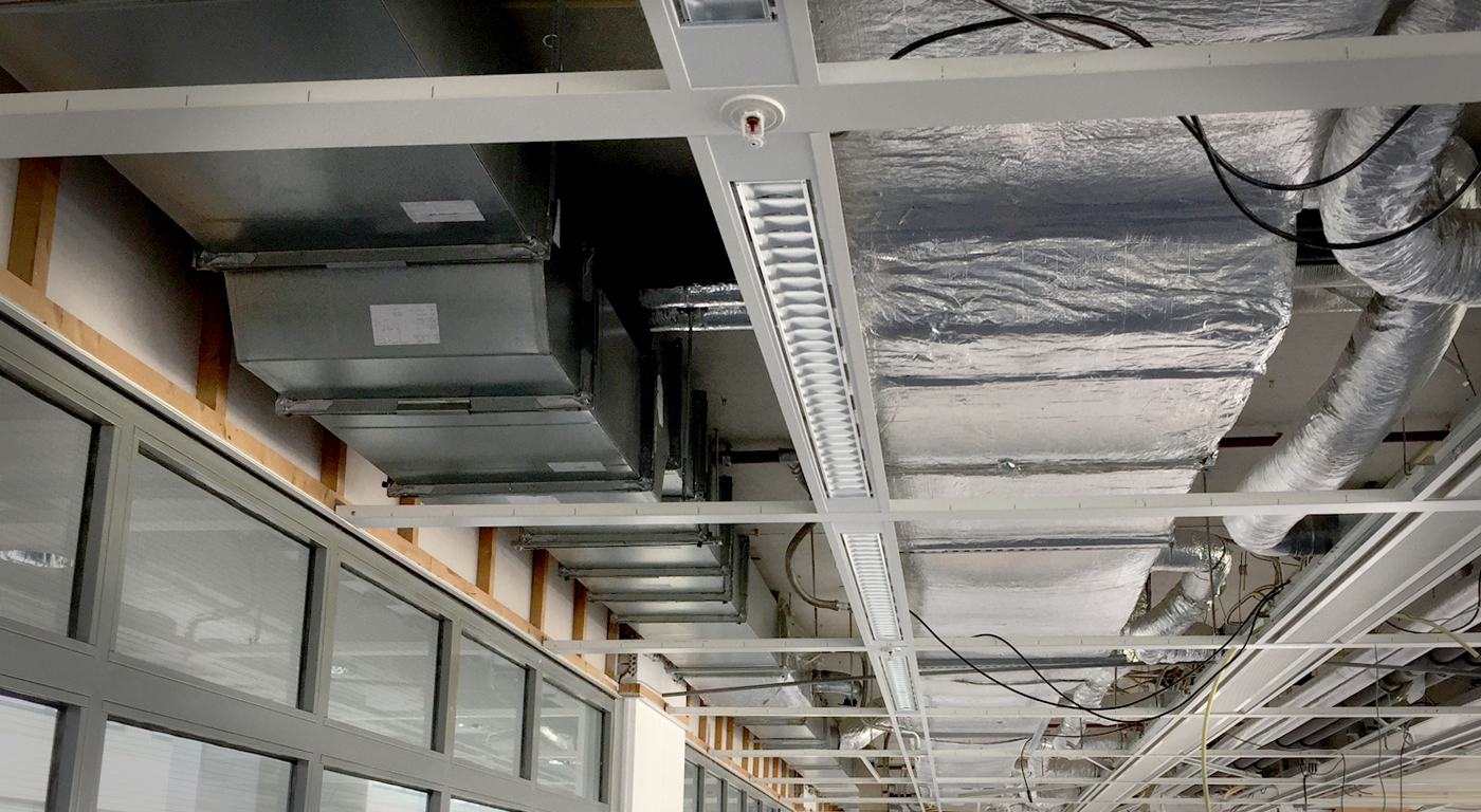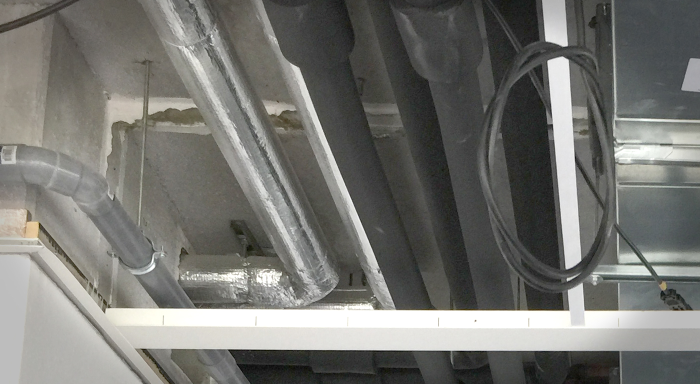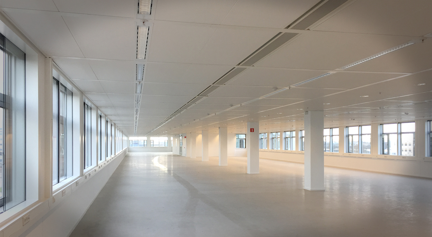 Een luchtsysteem neemt veel ruimte in beslag, maar het is dan ook van groot belang. Hoe groter de ventilatieschachten, hoe meer toevoer van verse lucht. Naast de schachten is er veel loze ruimte. Die kun je verstoppen boven een systeemplafond, maar je kunt er ook voor kiezen om die verborgen ruimte onderdeel te maken van de nieuwe inrichting. De ruimte wordt anders ervaren, als er niet een eentonig systeemplafond in hangt.