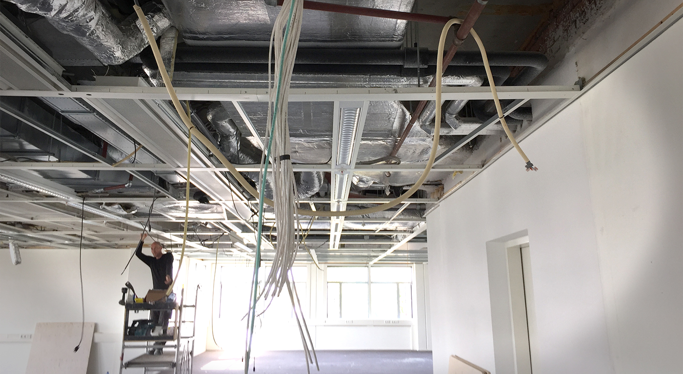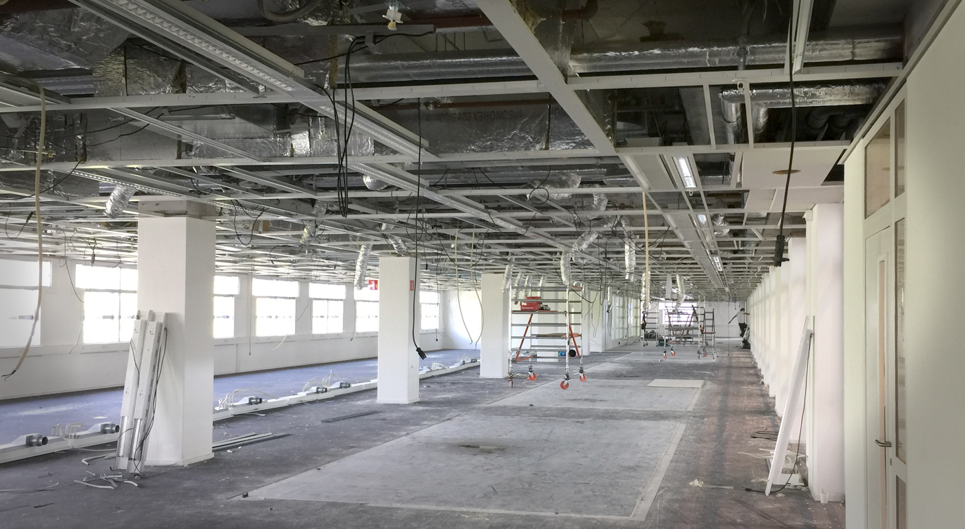 “Een plafond is meer dan een ding boven je hoofd. In het plafond bevindt zich een heel eigen wereld. Als je de foto’s van het nieuwe pand hierboven ziet, lijkt het een grote chaos. Maar als interieurarchitect word ik hier blij van. Zo zie ik een ventilatiesysteem dat de mogelijkheid biedt om overal verse lucht te brengen. Een onzichtbaar, maar belangrijk onderdeel van de nieuwe inrichting.